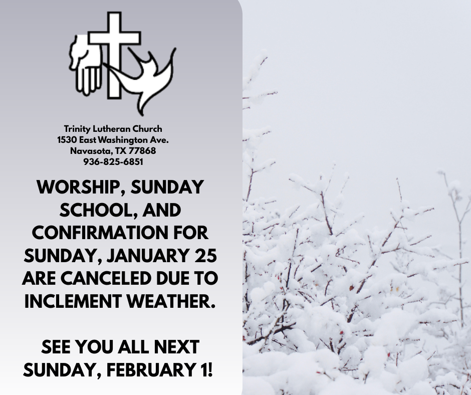 All church activities are canceled due to inclement weather Sunday, January 25.